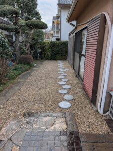 今回は防草シート、飛び石据え付け、砂利敷き工事の紹介させていただきます!